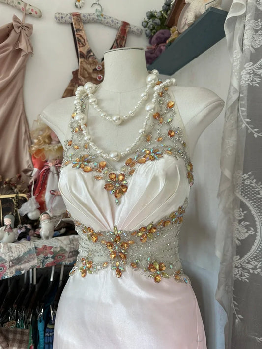 Pink Gradient Retro Fashion Elegant Exquisite Gem Beaded Mermaid Slim Strap Sleeveless Long satin Evening Dress Ball Gown Party Dress Prom Dress nv3810