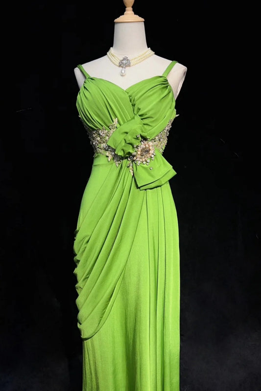 Green Sweet Elegant A-line Long Satin Short Sleeves Prom Dress Evening Dress Birthday Dress Graduation Dress nv74
