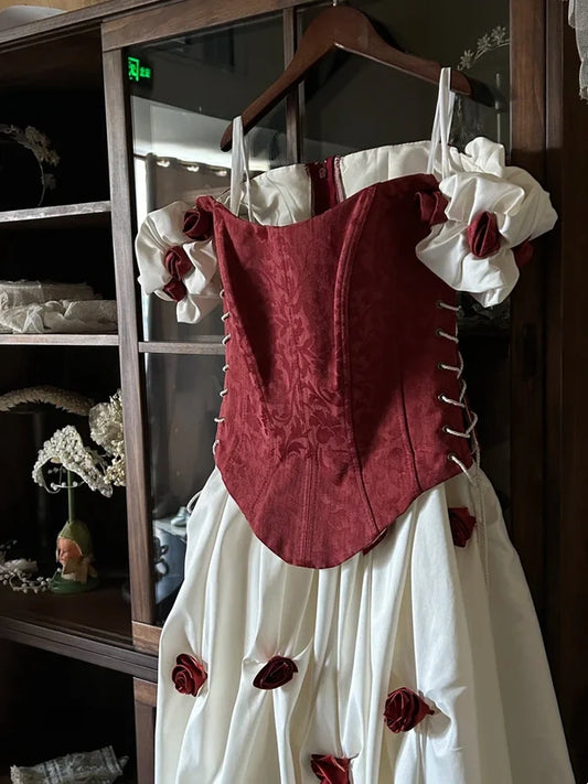 Red vintage floral long satin ball gown evening dress graduation dress nv4442
