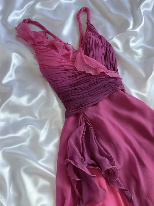 Pink Purple Fashion Gradient Ruffles Spaghetti Straps Short chiffon Mid-Length Homecoming Dress Prom Dress Birthday Party Dress Evening Dress nv3882