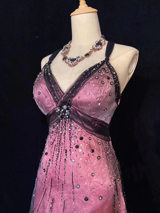 Pink stylish elegant shoulder strap exquisite handmade beaded long/Short satin floor-length prom dress, evening dress, party dress, homecoming dress nv3693