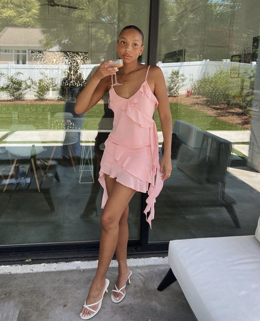 Pink Fashion Elegant Spaghetti Strap Short Chiffon Ruffle Homecoming Dress Ball Gown Evening Dress Holiday Party Dress nv3495