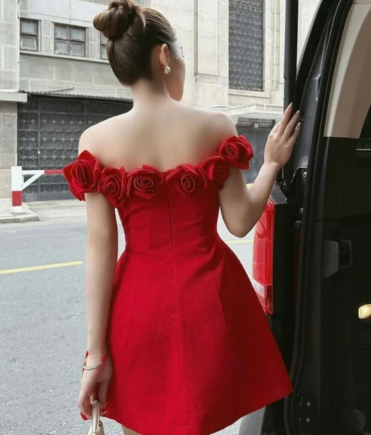 Red Off Shoulder Rose Lace Neckline A-Line Short Mini Homecoming Dress Birthday Christmas Party Dress Princess nv2741