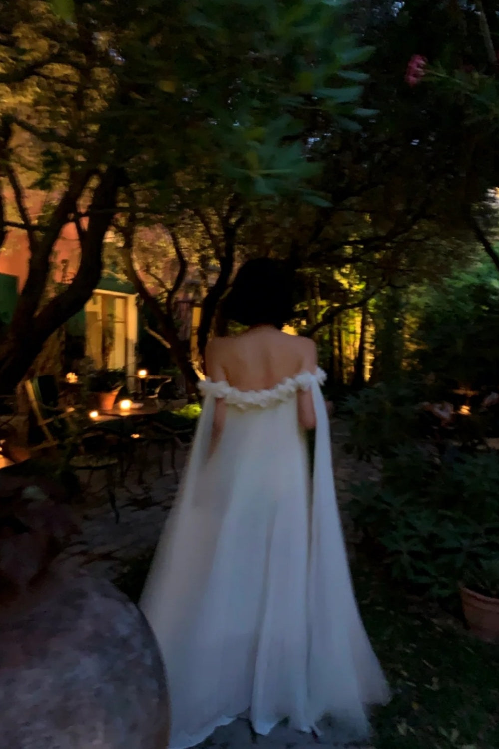 French 3D Flower Off-the-shoulder Gown: Pleated Chiffon, Backless Sash, Fairy Hot Spring Resort Dress NV6402
