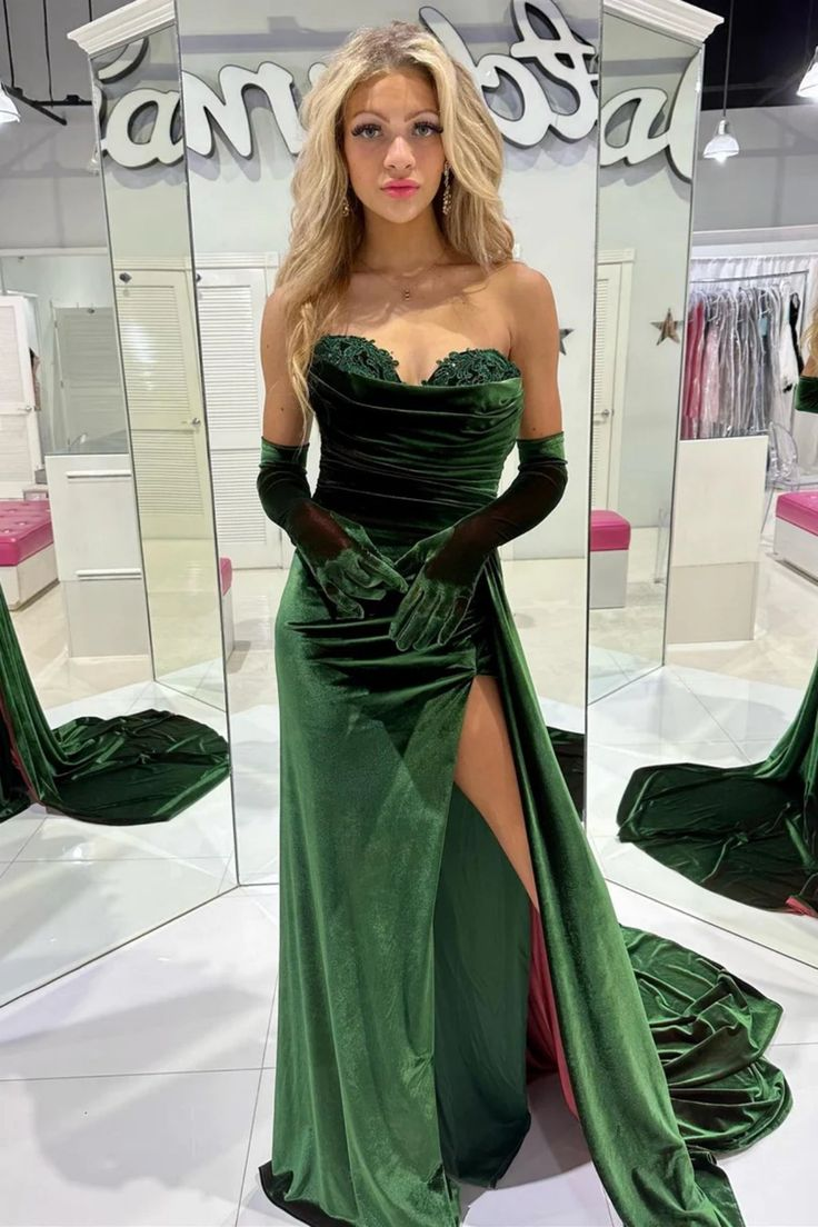 Mermaid Emerald Green Velvet Long Prom Dress with Train High Slit Formal Dress nv1382