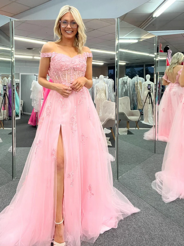 Off Shoulder Pink Lace Long Prom Dresses with High Slit, Pink Lace Formal Dresses, Off the Shoulder Pink Evening Dresses nv1047