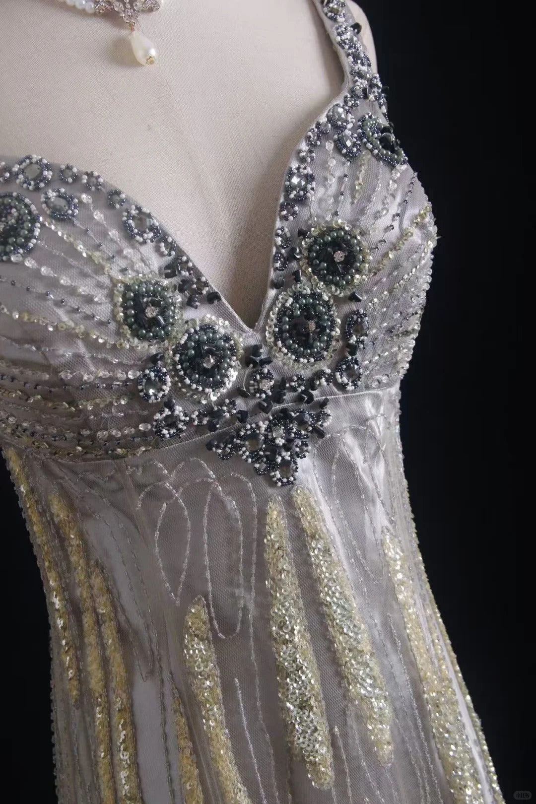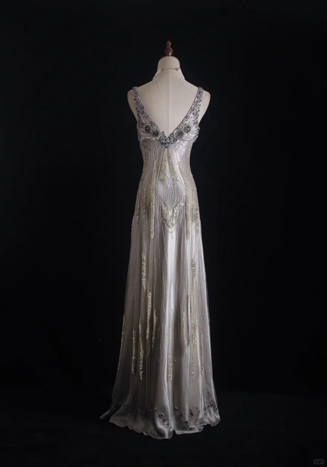Silver tulle beaded, shiny and gorgeous, Galaxy Heavy Vintage double-shouldered Gatsby-style dress, ball gown, evening gown, party dress nv5207