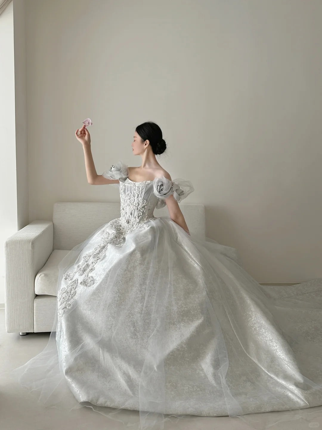White Gorgeous Exquisite Beaded Floral Long Floor Length Train Satin Ball Gown Evening Gown Wedding Dress nv4069