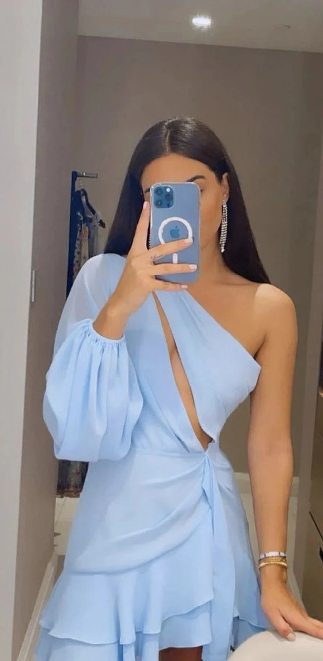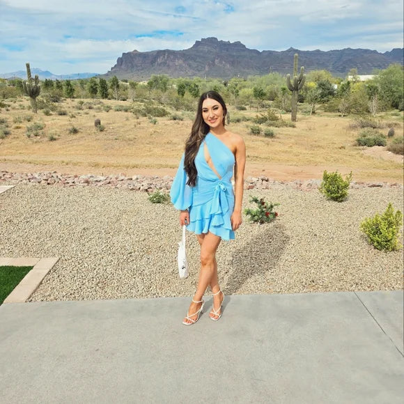 Women's Solid Color Asymmetrical Neckline Hollow Out Lace-up Dress With Ruffle Hem nv1668