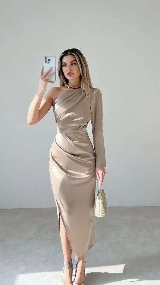Light color fashion one shoulder satin elegant mid-length party dress evening gown prom dress nv1736
