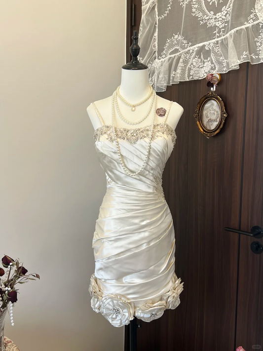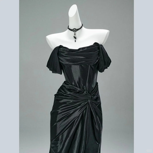 NiceVestidos-Long simple spaghetti strap satin pleated prom dress, retro dress Nv5630