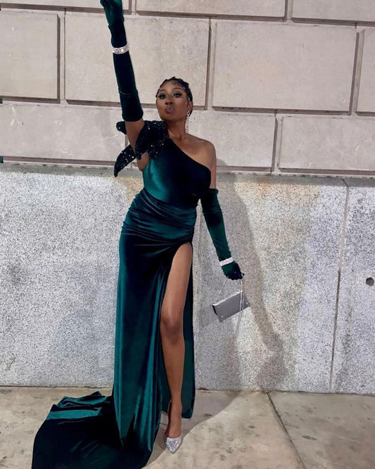 Green fashion one shoulder long velvet sexy slit ball gown evening dress nv3282
