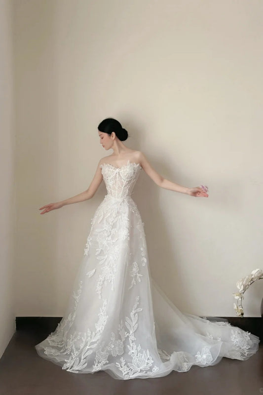 White Veil Flower Garden Strapless Embroidery Train Wedding Dress NV6573