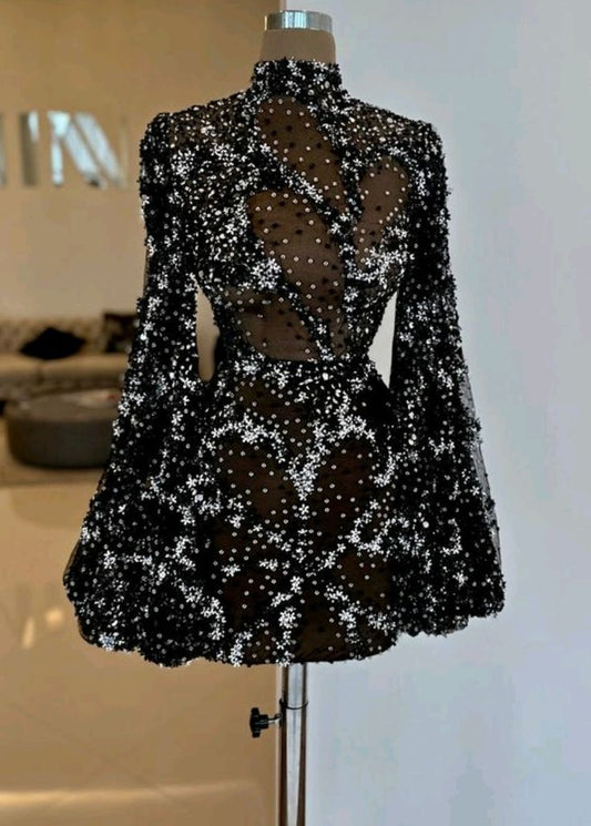 Black gorgeous fashion unique shiny sequins short long sleeve see-through ball gown evening dress party dress nv3232