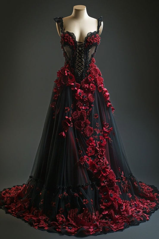 Black gorgeous exquisite floral elegant long tulle ball gown evening dress wedding dress nv3378