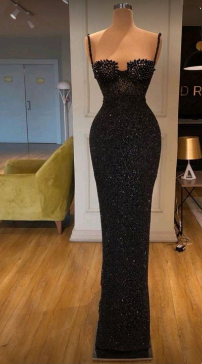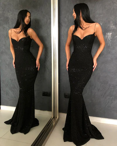 Black Sheath Spaghetti Straps Open Back Sequins Prom Dresses nv133