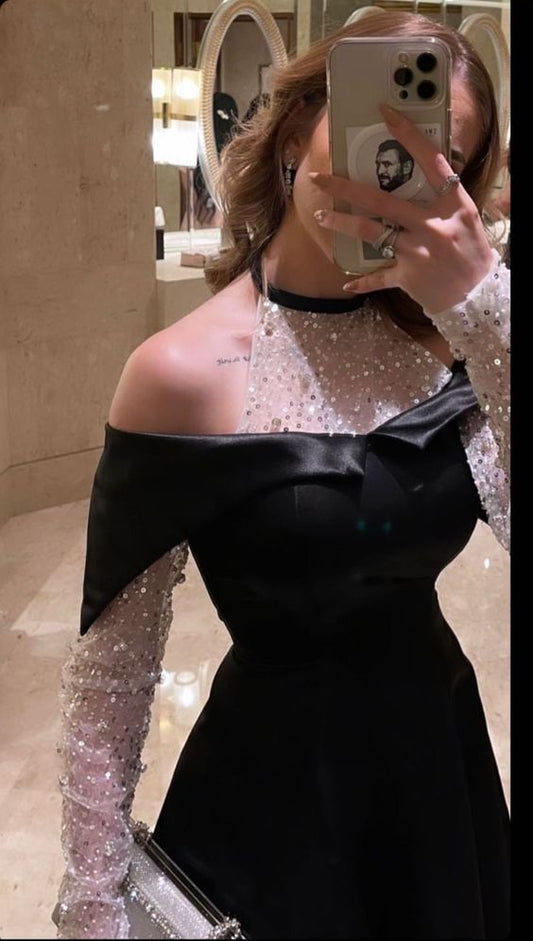 Black Shiny Elegant Crystal Mirror Decoration Off Shoulder A-Line Long Satin Ball Gown Evening Dress nv3158