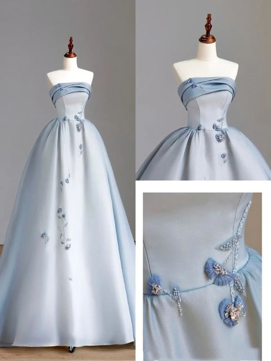 Blue Elegant Long Satin Pleated Holiday Party Dress Special Occasion Dress Strapless Floor Length Ball Gown nv2959