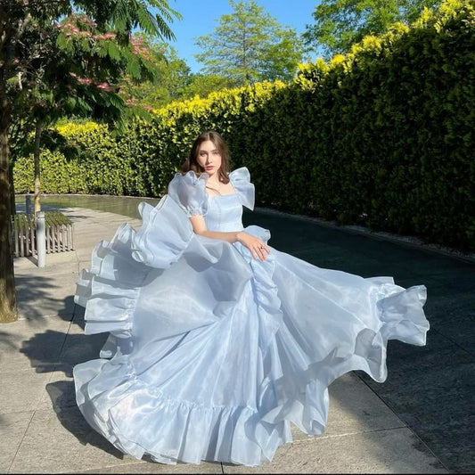 Blue sweet elegant tulle long short sleeve ball gown evening dress nv2922