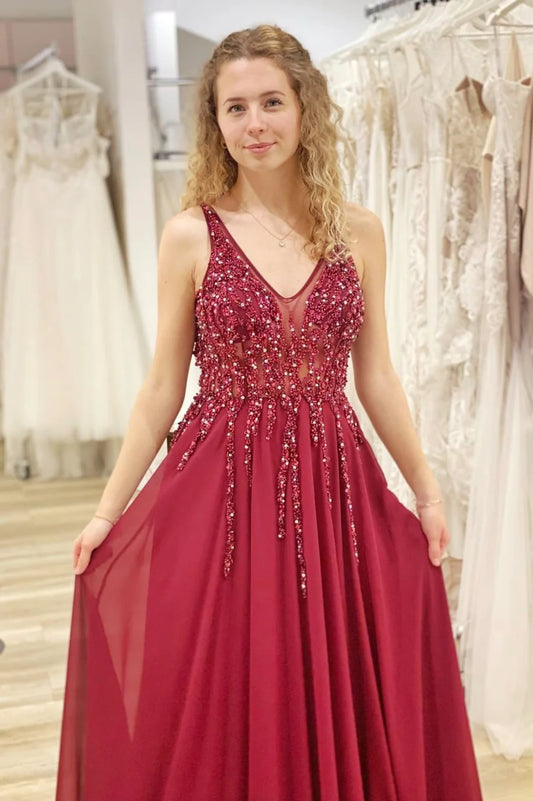 Burgundy Chiffon Beading Long Prom Dresses, A-Line Evening Dresses nv1452
