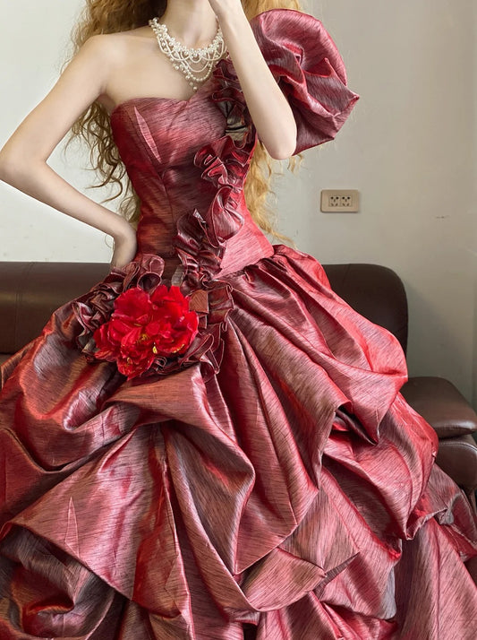 Red floral pleated fashionable long satin princess ball gown nv5045