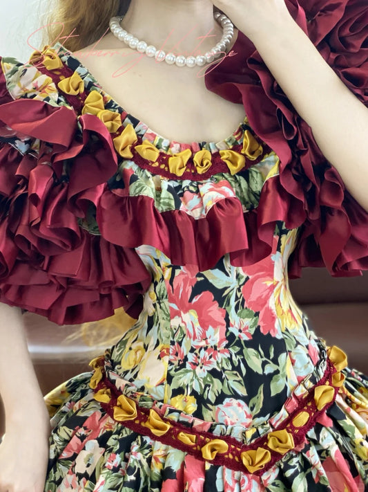 Red colorful floral unique beautiful Spanish vintage long ball gown princess. nv5082