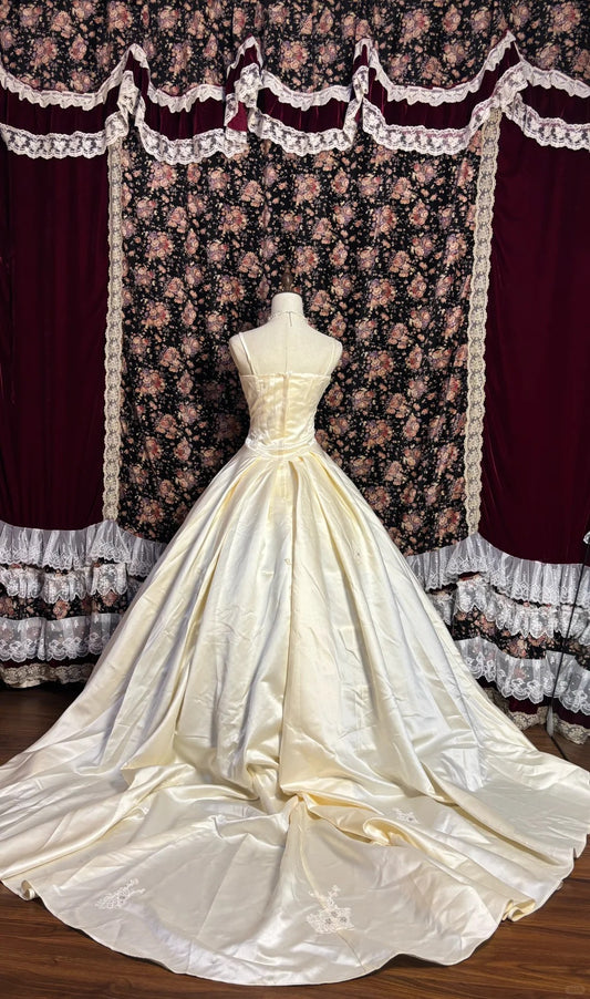 Cream Yellow Gorgeous Exquisite Lace Spaghetti Straps Long Satin Floor Length Train Princess Ball Gown Evening Dress nv4018