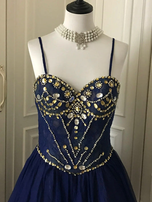 Blue Vintage Exquisite Beaded Lace Spaghetti Strap Long Prom Gown Evening Dress Party Dress nv3540