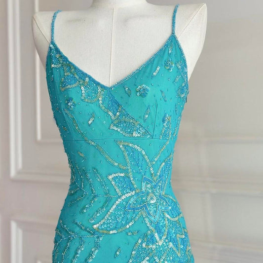 Turquoise homecoming dress vintage y2k fairy boho floral beaded sequin embroidery midi chiffon suspender dress prom dress evening gown party dress nv4411