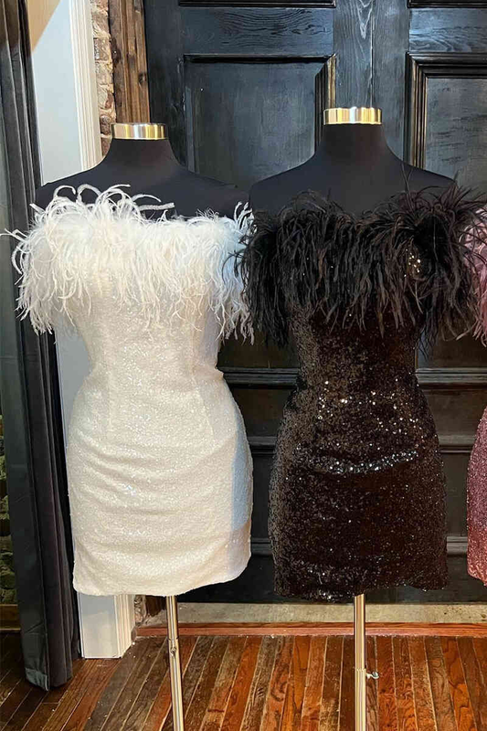Bodycon Strapless Blue Sequins Short homecoming Dresses with Feather nv1244