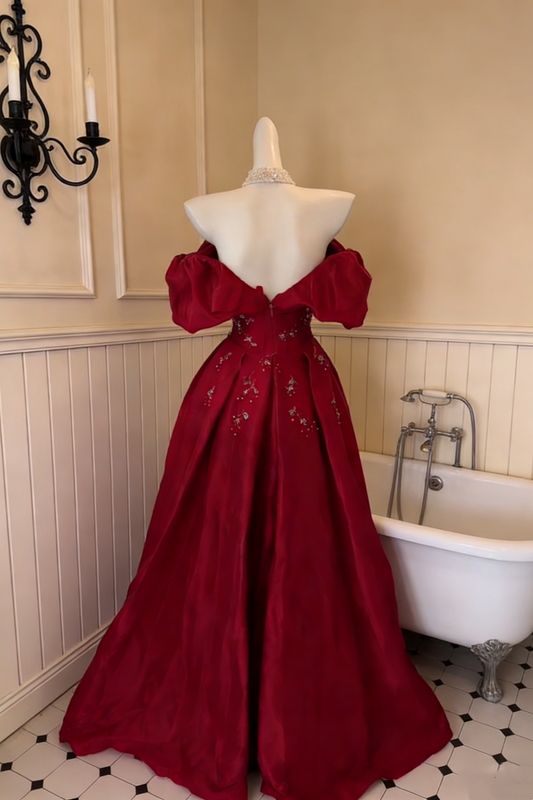 Retro Prom Burgundy Retro Prom Gown - Off-Shoulder Puff Sleeve Beaded Floral Train Party Maxi Dress NV6825