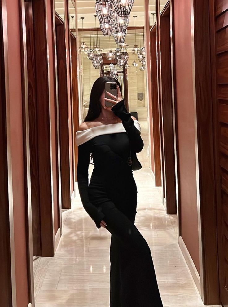 Black solid contrast off-the-shoulder one-step skirt ball gown evening dress nv1939