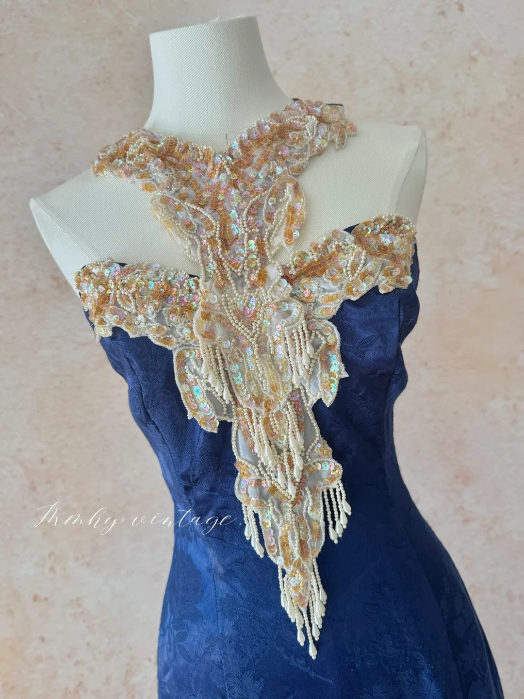 Blue Retro Elegant Halter Neck Exquisite Sequins Pearl Tassel Long Slim Sexy Prom Dress Evening Dress Adult Ceremony Dress Birthday Dress Prom Dress nv4098