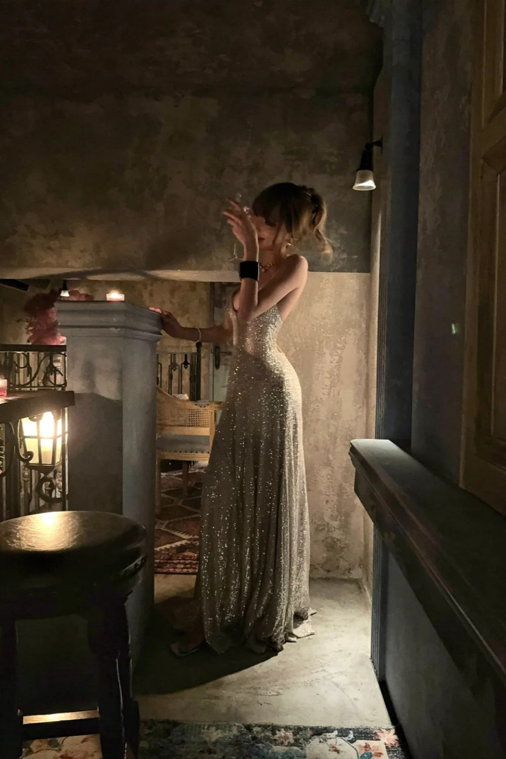 This champagne sequin spaghetti strap maxi evening dress is crafted with full-body shimmering sequin fabric—eye-catching under lights, perfect for galas, parties, or formal events. The thin spaghetti straps and deep V-neck design add a sleek, elegant touch, while the floor-length silhouette (with a high slit) balances grace and modern sexiness. We offer custom size/color options and bespoke design services to fit your unique style.