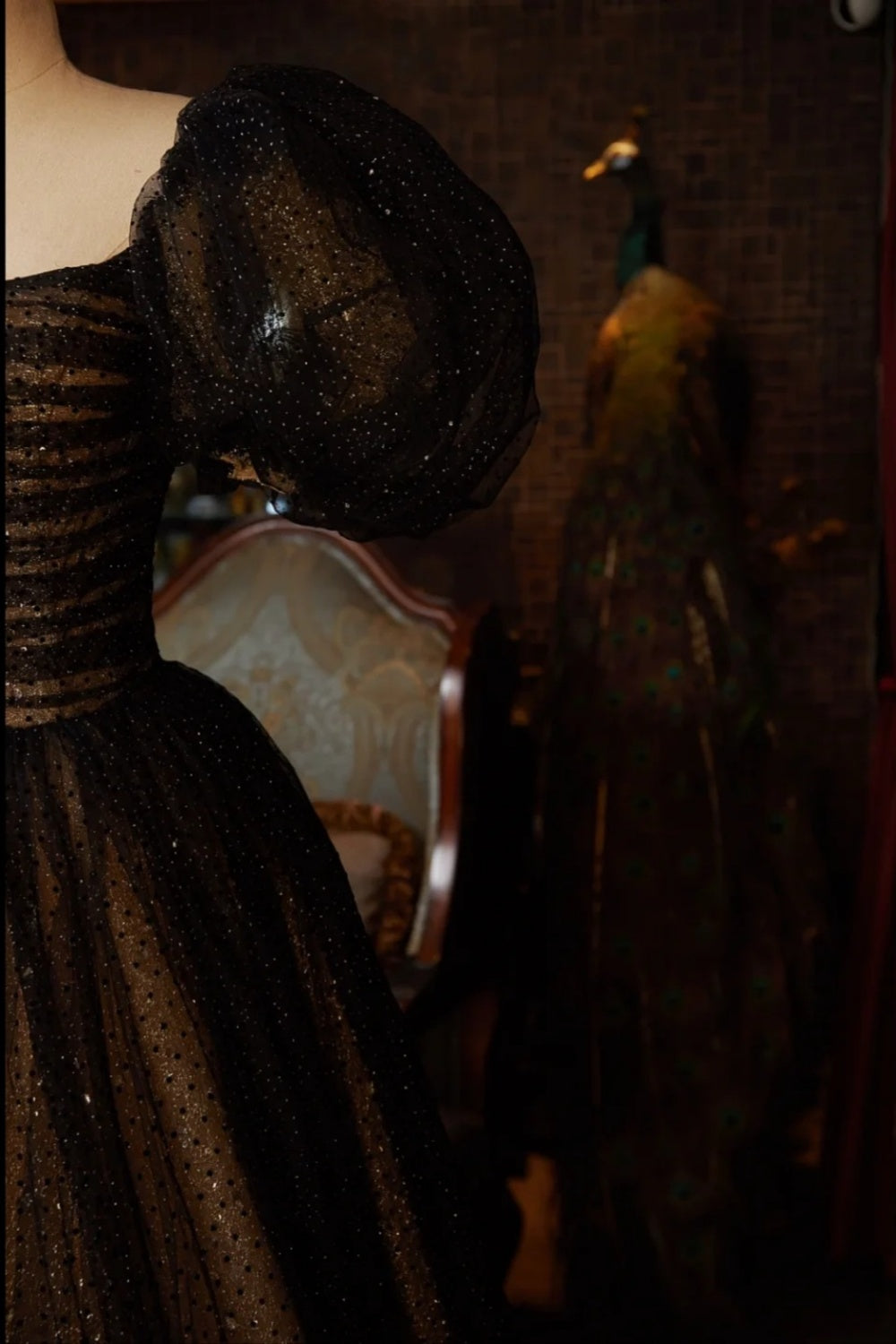 Dark Gold-Embroidered Dress, Mysterious Retro Long Shimmering Gown NV6537