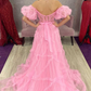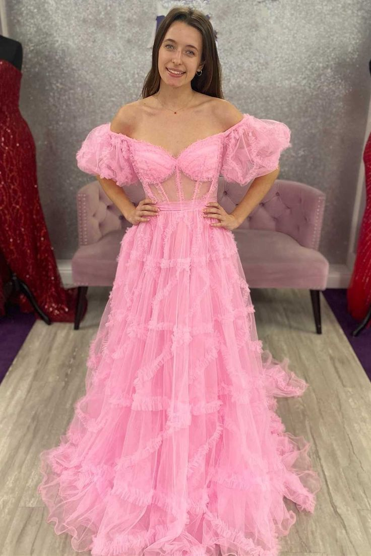 Princess Pink Off-the-Shoulder A-Line Prom Dress with Ruffles nv1309