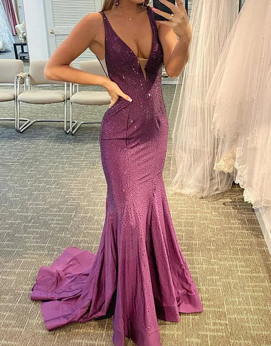 MERMAID DEEP V-NECK HALTER CHAPEL BACKLESS PAILLETTE PROM DRESS nv937