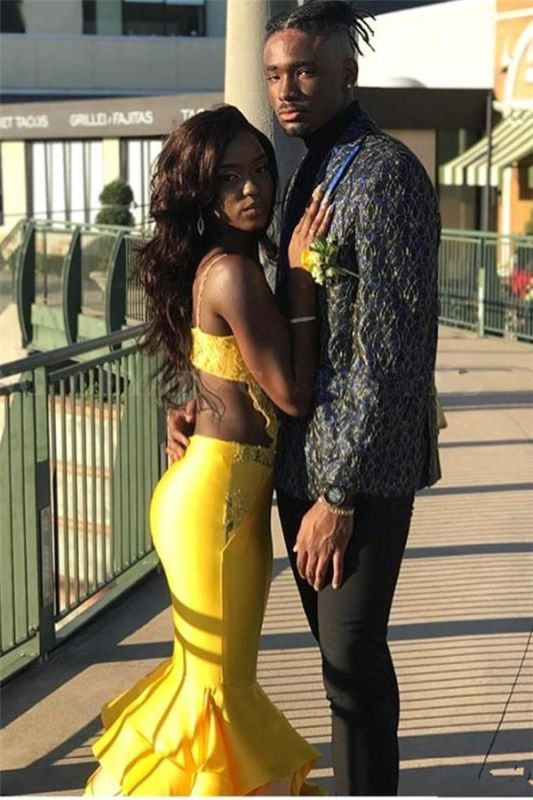 Sexy Stpaghetti-Straps Ruffles Mermaid Prom Dresses | Open-Back Appliques Sleeveless Evening Gowns nv944