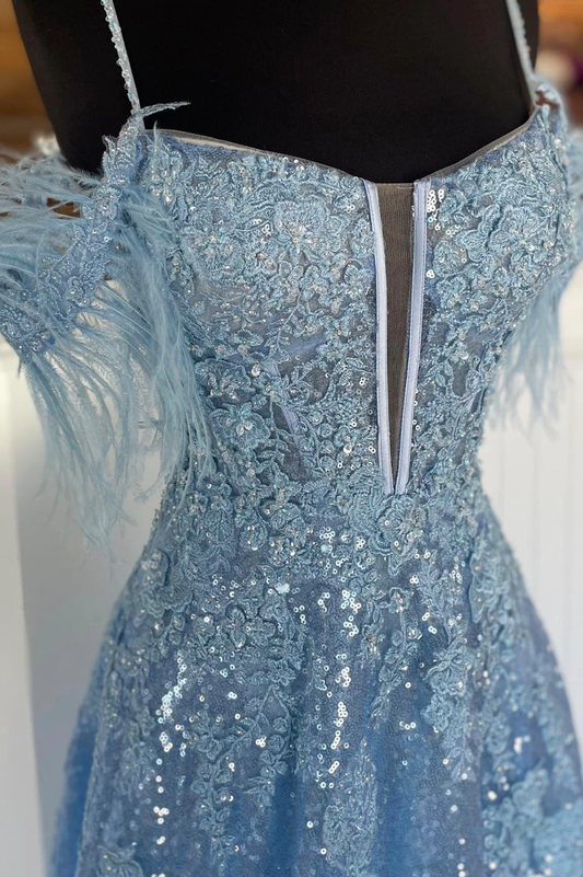 Blue Spaghetti Strap Sequined Lace Prom Dress, Blue Lace-Up Evening Dress nv828