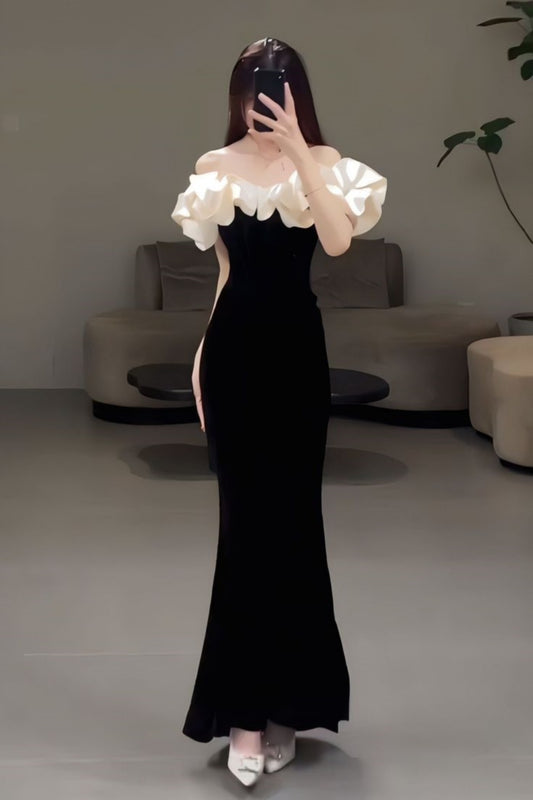 Black velvet off-the-shoulder ruffled neckline long mermaid slim elegant ball gown evening dress nv3180