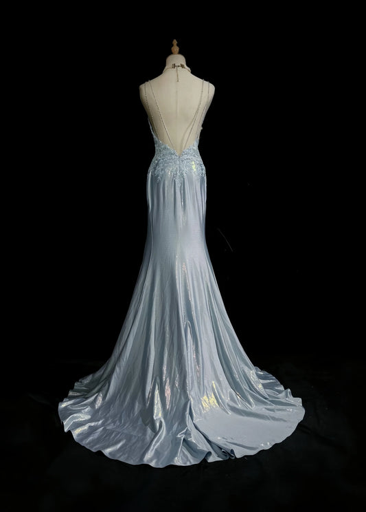 Blue Beaded Backless Long Satin Ball Gown Evening Gown Graduation Gown nv4402