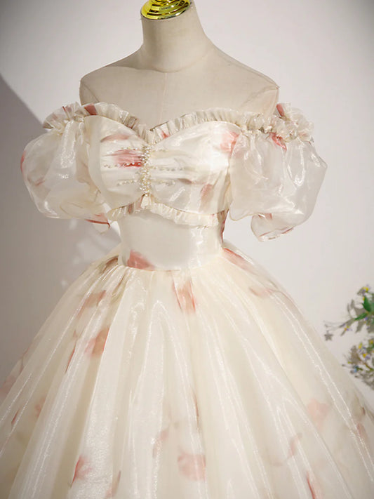 Champagne Floral Tulle Long Prom Dress, Beautiful Short Sleeve A-Line Evening Party Dress nv1614