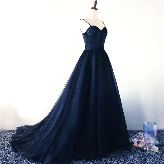 Charming Navy Blue Tulle and Satin Straps Long Party Dress, Navy Blue Prom Dress nv609