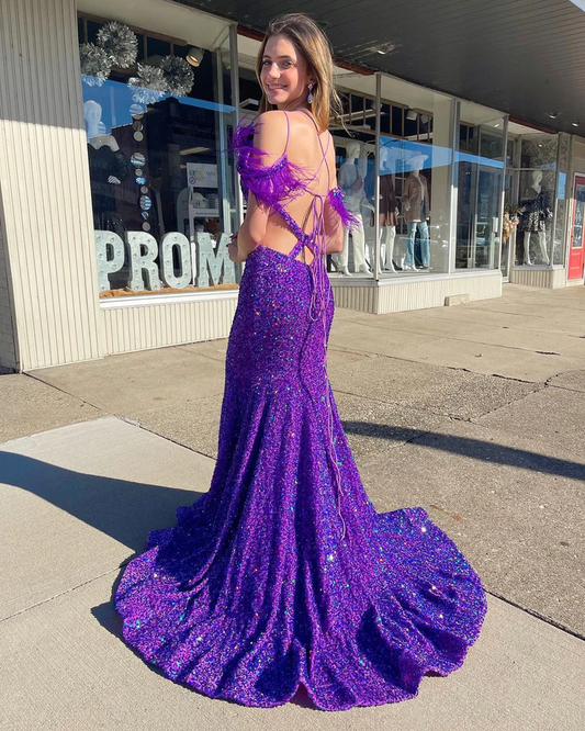 Charming Mermaid Purple Sequins Long Prom Dresses with Feather nv466