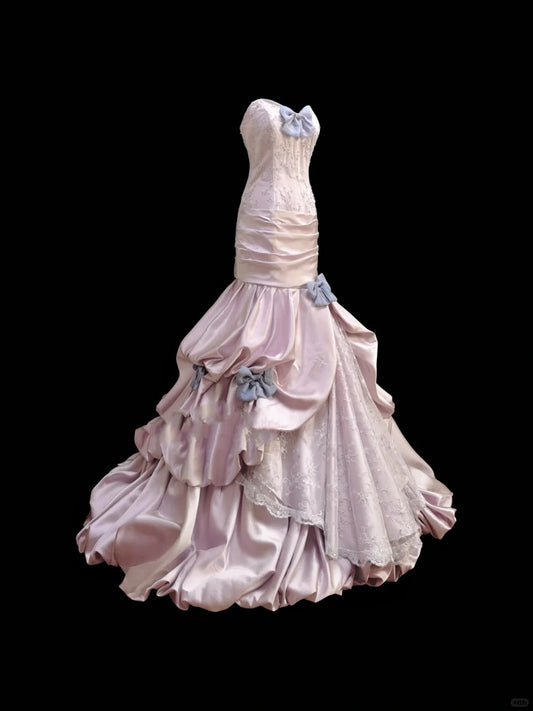 Pink Sweet Lace Bow Long Tulle Satin Princess Ball Gown Evening Dress Party Dress Adult Ceremony Dress Birthday Dress nv4199