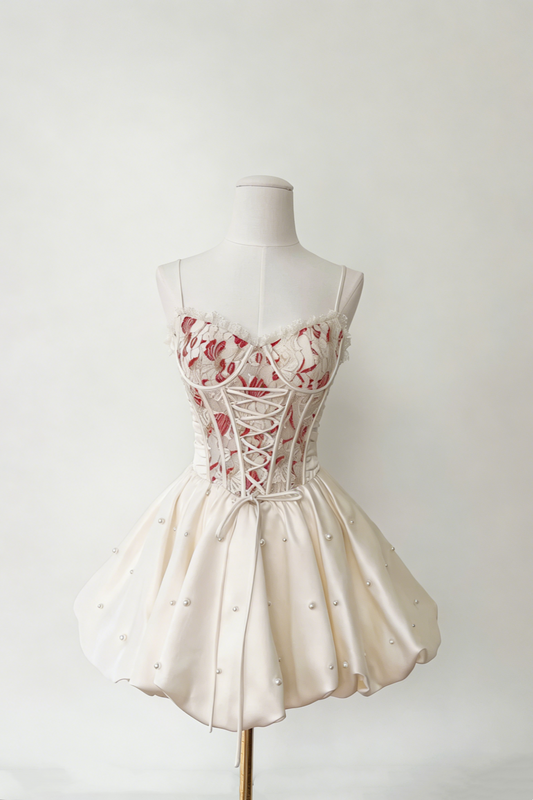 Red & White Contrast Lace Lace-Up Puff Dress - Gentle Style Birthday Party Gown NV6788
