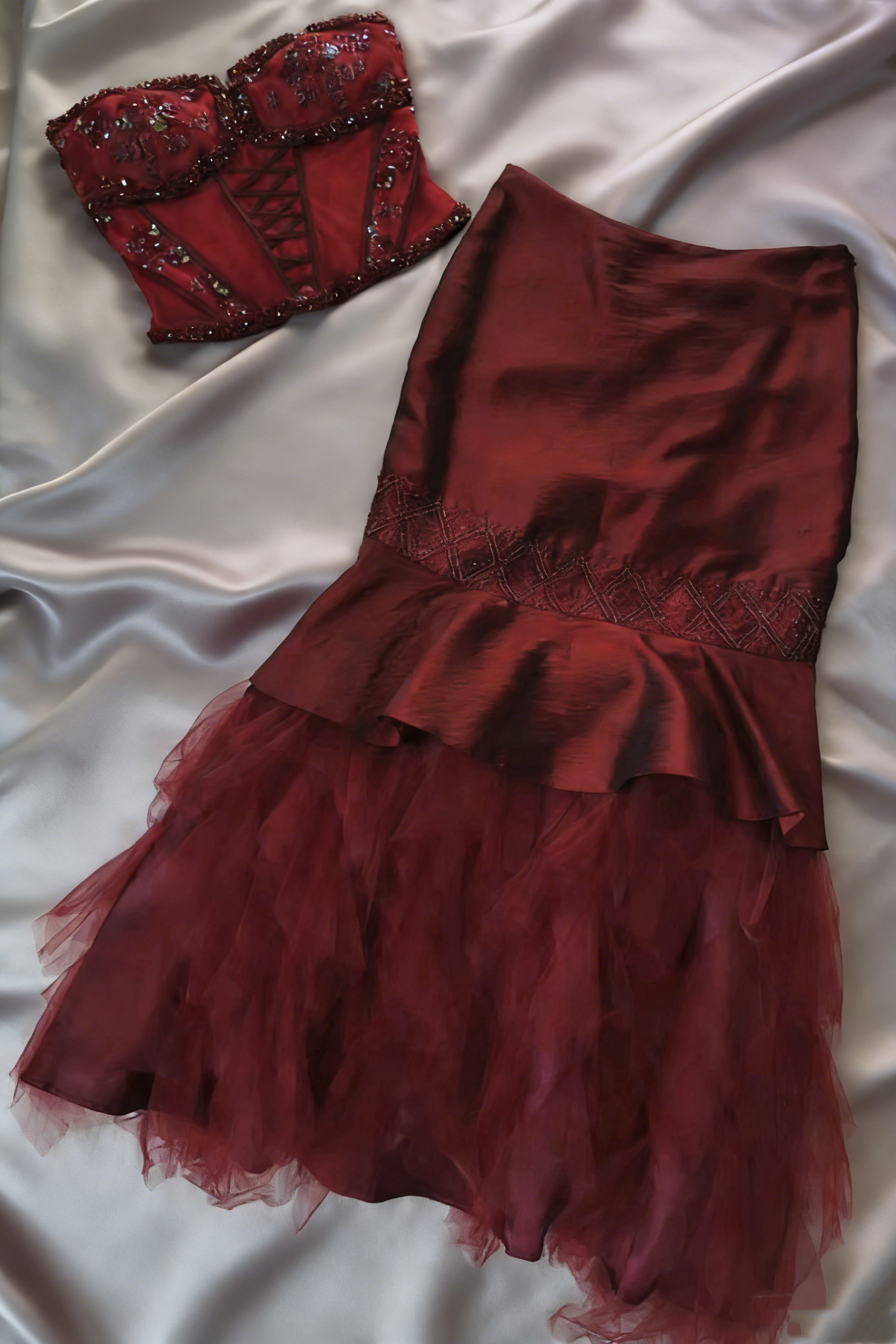 ✨Burgundy Two-Piece Gown - Beaded Bustier & Tulle Skirt NV6760
