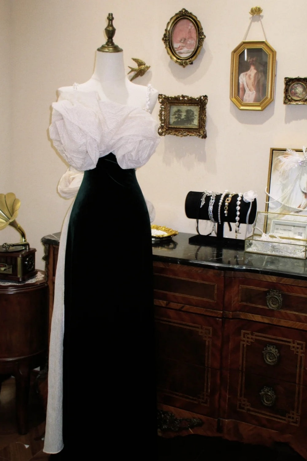 This velvet & white ruffle evening dress features an asymmetrical ruffled strap and tailored silhouette, blending luxurious velvet texture with airy ruffled fabric for a retro-artistic look. The floor-length skirt adds elegance, making it ideal for art galas, vintage parties, or engagement events. Custom size/color options are available to match your style.