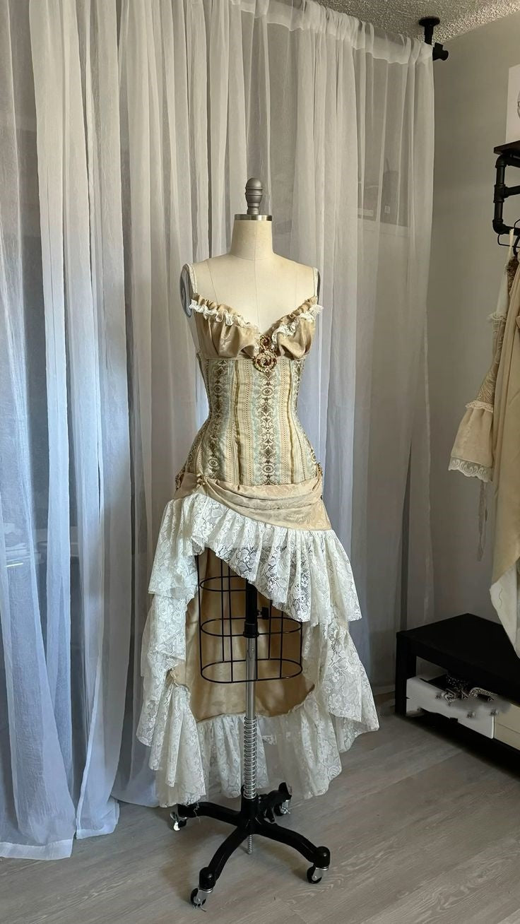 Champagne Gold Retro Fashion Exquisite Lace Elegant Long Satin Princess Court Style Ball Gown Evening Gown Party Dress nv3595