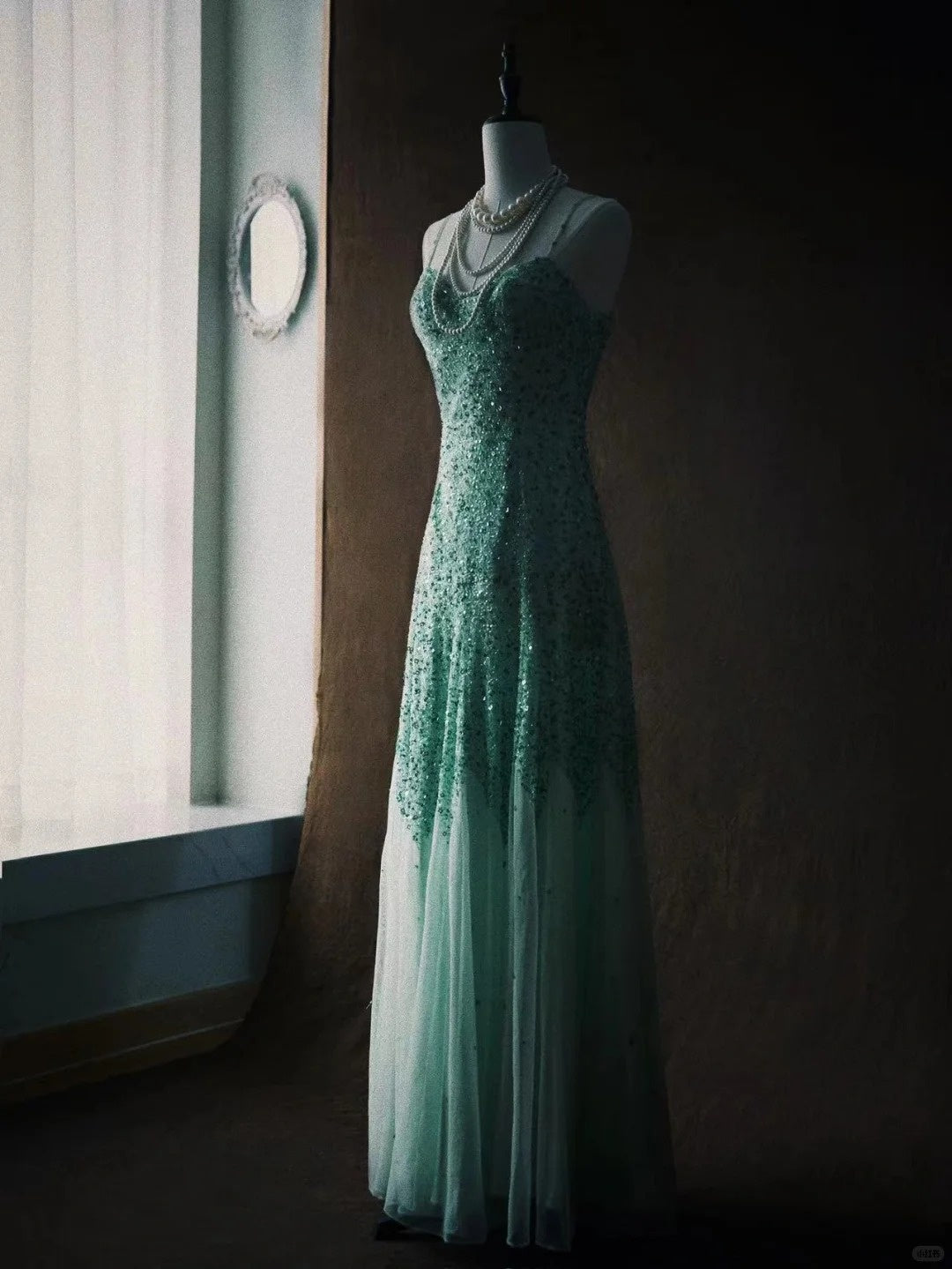 Green sequins exquisite bead decoration retro long chiffon formal dress NV6611